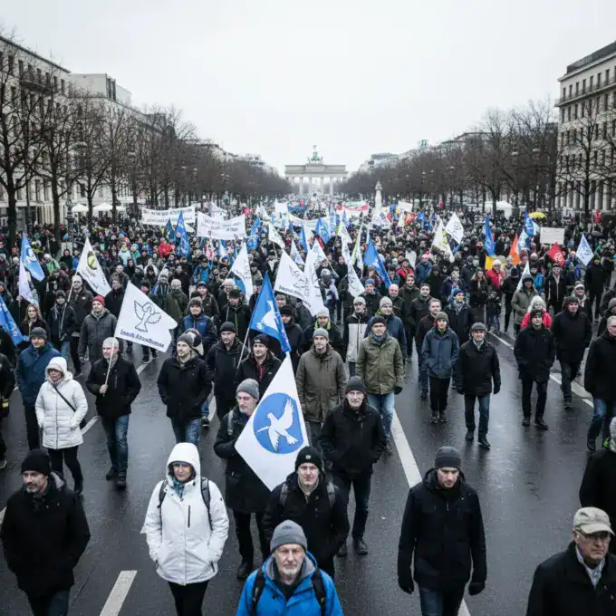 Thousands of people gathered in Berlin for the annual Easter March on Saturday, April 4, 2026, to protest against rearmament and call for...