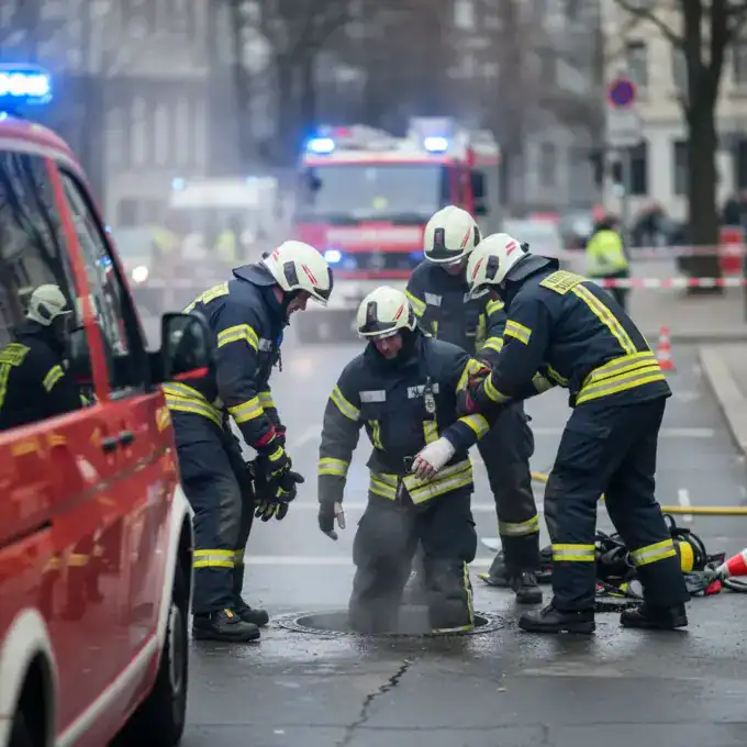 A Hamburg professional firefighter sustained severe scalding injuries after falling into an open, 1.60-meter-deep manhole filled with hot water during an operation in...