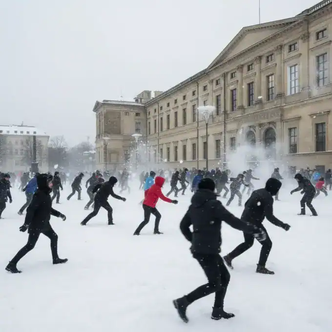 Around 300 people engaged in a massive snowball fight in front of the Alte Pinakothek in Munich last week, following an Instagram call...