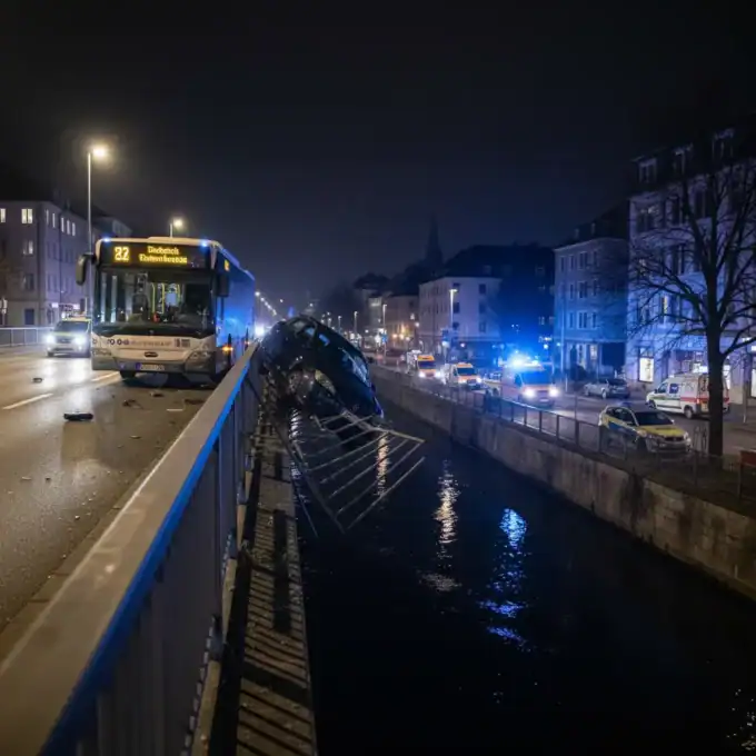 A collision between a bus and a car in Munich resulted in significant damage to a bridge railing, prompting a large fire department...